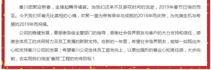 熱烈祝賀陜西秦川公司《2019年創(chuàng)新發(fā)展年會(huì)》圓滿落幕,恭祝大家:新年快樂,身體健康,闔家幸福!