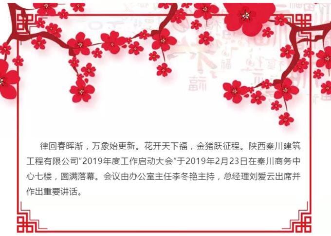 熱烈祝賀陜西秦川建筑工程有限公司“2019年度工作啟動(dòng)大會(huì)”圓滿落幕。秦川建筑全體同仁斗志昂揚(yáng)、迎接新挑戰(zhàn),我們將矢志不渝、齊心協(xié)力、奮力拼搏,同心共筑秦川夢(mèng)·我的夢(mèng),譜寫(xiě)秦川2019新華章。