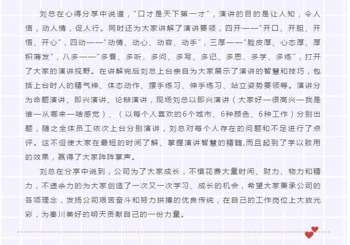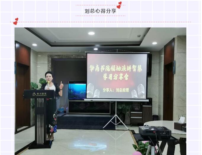 28日晚,劉總經(jīng)理在秦川商務(wù)中心七樓,召開了學(xué)習(xí)心得交流會,本次會議時長4小時,會議在歌唱《祖國頌》和背誦企業(yè)文化中拉開了序幕。