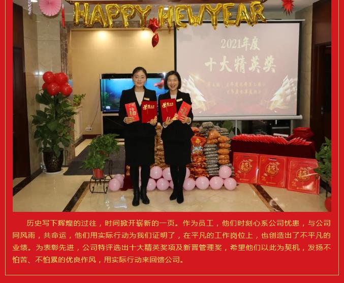 2021年終表彰暨福利發(fā)放大會(huì) 歲月不居,時(shí)節(jié)如流。70多年的光輝歷程和與春秋歲月,書寫了華夏民族的勤勞勇敢,留下了中國人的敬業(yè)拼搏。15年來秦川人秉承敬業(yè)拼搏精神,不懼風(fēng)雨,不斷突破,篳路藍(lán)縷,以啟山林,努力實(shí)現(xiàn)著秦川人的夢(mèng)!過去的一年是努力拼搏的一年,也是我們值得驕傲的一年,通過全體員工的共同協(xié)作,公司的各項(xiàng)工作在逆境中依然取得了較好的成績,每一次的成績凝聚著大家共同的汗水,未來的機(jī)遇和挑戰(zhàn)需要我們繼續(xù)不懈努力去面對(duì)。 在取得成績的同時(shí),我們也要學(xué)會(huì)感恩。感恩是一種美德,是一種態(tài)度,一個(gè)懂得感恩的人,才能成就他生命的事業(yè)高度。首先,我們要感恩我們的國家,我們國家的各項(xiàng)政策使得我們國富民強(qiáng),作為企業(yè),我們要積極響應(yīng)國家各項(xiàng)政策,樹立堅(jiān)定的民族精神和信仰,用這種強(qiáng)大的精神信仰去描繪祖國未來的宏圖,將我們的一片丹心和滿腔熱血獻(xiàn)給祖國,用自己的智慧為祖國的建設(shè)奉獻(xiàn)自己的力量。其次,我們要感恩員工,一個(gè)企業(yè)的發(fā)展興衰,靠的是每一位員工高度的執(zhí)行力、忠誠度和感恩的情懷,感恩意味著和公司同舟共濟(jì)。如果企業(yè)是一條船,那我們就是一雙雙手,只有我們共同伸出雙手,讓千萬支雙手一起使勁,我們的航船才能劈波斬浪,勇往直前。 2021年我們有太多的故事和感動(dòng),2022年我們又有更多的期望和夢(mèng)想。夢(mèng)想的畫卷正徐徐展開,讓我們用今天的奮斗,成就明天的光榮,不忘初心再出發(fā),牢記使命勇?lián)?dāng),奮力拼搏,續(xù)寫光輝。最后祝愿我們的祖國繁榮富強(qiáng),我們的中華兒女安居樂業(yè),我們的事業(yè)蒸蒸日上,我們的公司前程似錦!